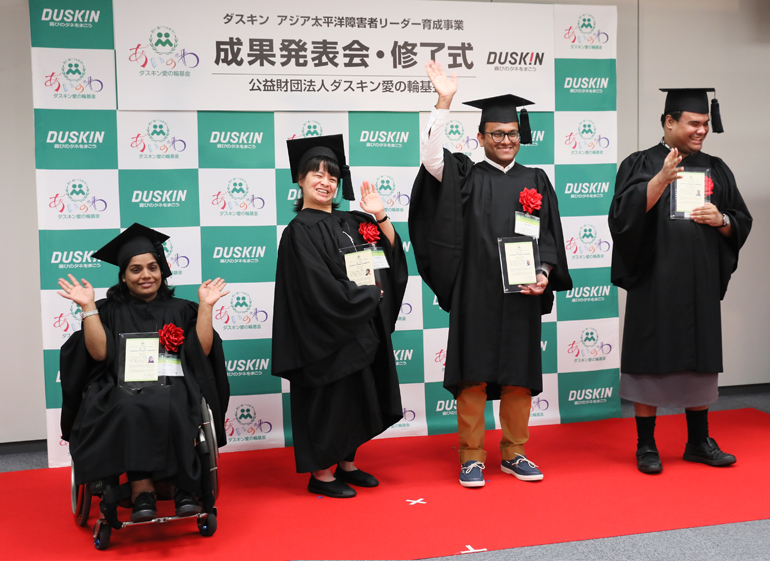 研修生4名の成果発表、修了式ではアカデミックガウンと帽子に身を包んだ姿を全国の関係者や母国のご親族にご覧いただきました。 コロナ禍の中、研修にお力添えをいただきました皆様には心よりお礼申し上げます。終了後、母国のご親族と連絡をとり、研修生たちは満面の笑みでした。 激励の言葉をいただきました愛の輪東京地域実行委員長の川島商彦様、株式会社ダスキン東京地域本部の皆様、南関東地域本部の皆様、ソーシャルディスタンスを守りながら、応援いただいた皆様、ありがとうございました。 そして、画面越しに大きなエールをおくって下さった全国、アジア太平洋地域の皆様、本当にありがとうございました。