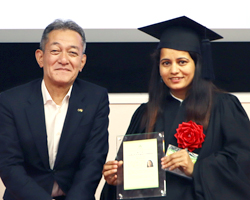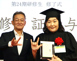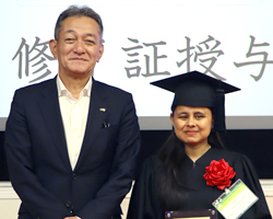 研修生4名は、来場した支援者の皆様に、自分達を「4つの喜びのタネ」に例えて、多くの人たちのお陰で充実した時間が送れたことを報告。財団理事長より母国でのリーダーとしての活躍を祈念して一人ひとりに修了証が手渡されました。来場された方々からキャップとガウンに身を包んだ彼女たちへ惜しみないエールの拍手が送られました。